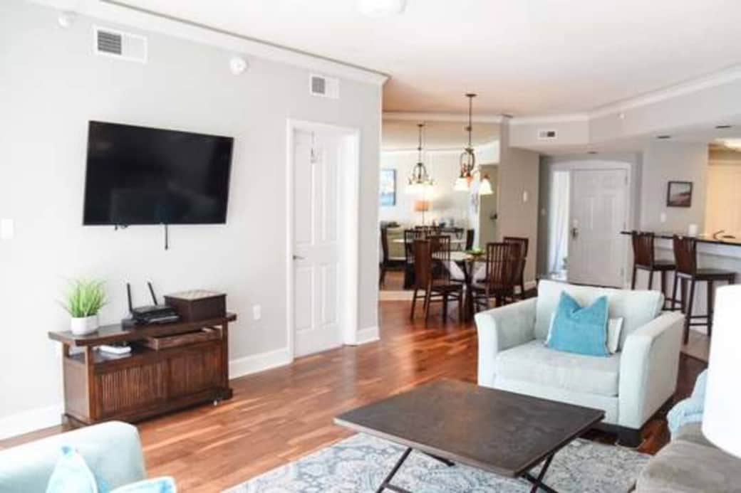 * New 50” smart TV in living room, sofa bed, sliding door to balcony with a table and seating for 4. Bedroom has a king bed, flat screen tv, attached large private bath vanity in master bedroom. Cable TV in bedroom. Cable TV and Smart TV Streaming services available in living room. Super high speed internet provided. Perfect for remote working too.
